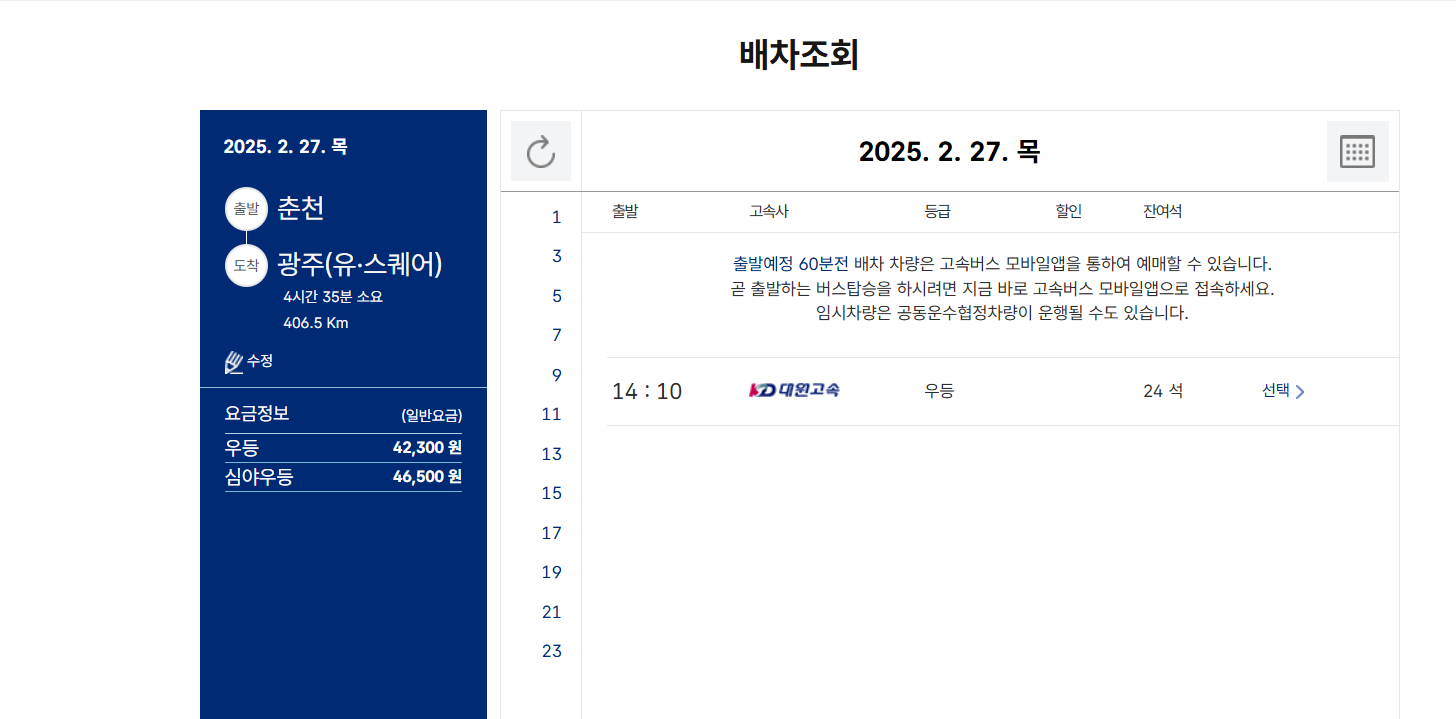 팁: 당일 출발 1시간 전까지 예매 가능하며, 출발 1시간 미만이라면 모바일 앱을 이용하세요.