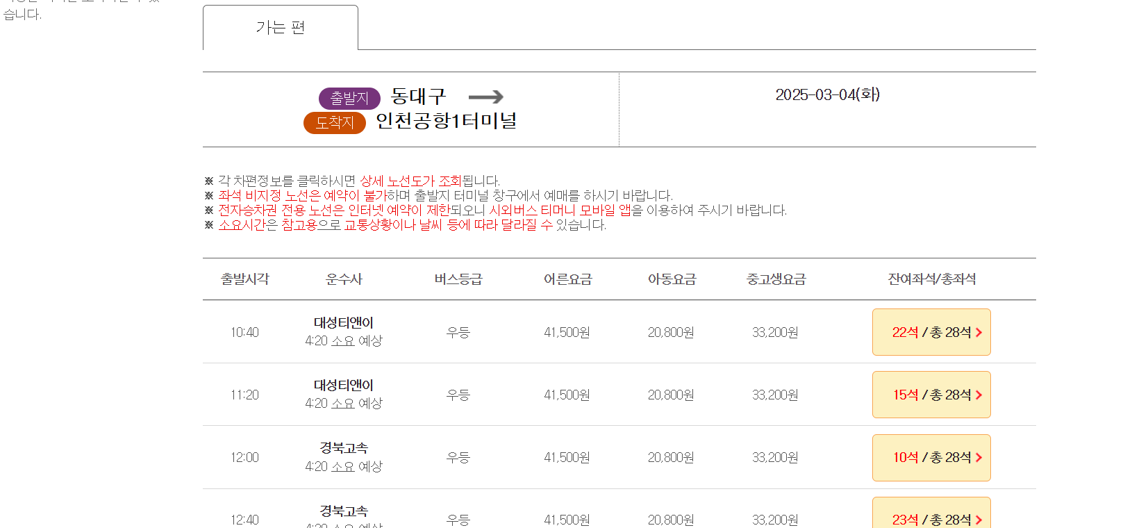 대구-인천공항 리무진 버스는 사전 예매가 필수입니다. 특히 새벽 시간대나 주말에는 만석이 될 가능성이 높으니 미리 좌석을 확보하는 것이 중요합니다.