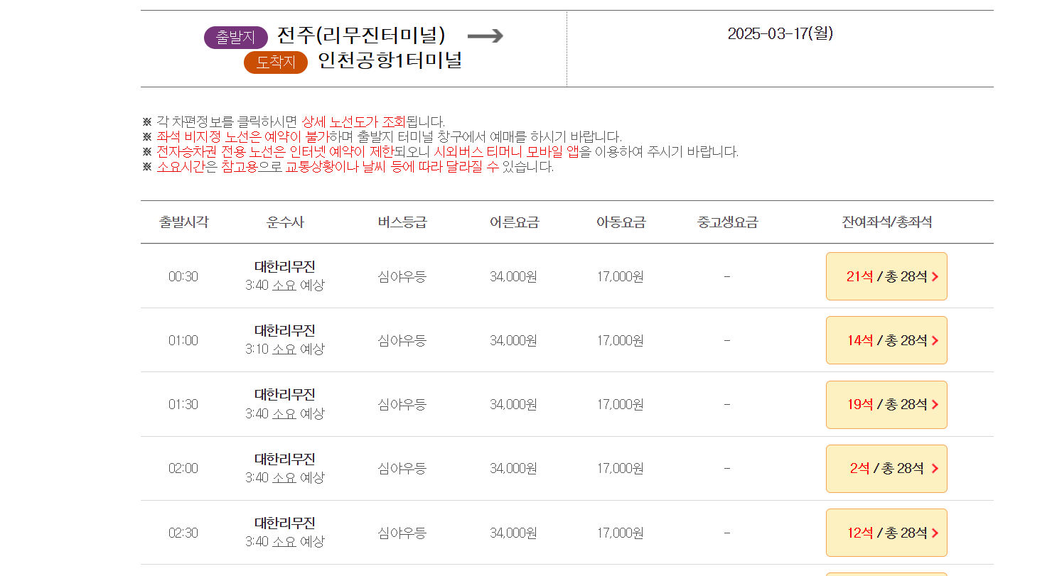 전주에서 인천공항으로 가는 리무진버스의 시간표와 요금은 다음과 같습니다: