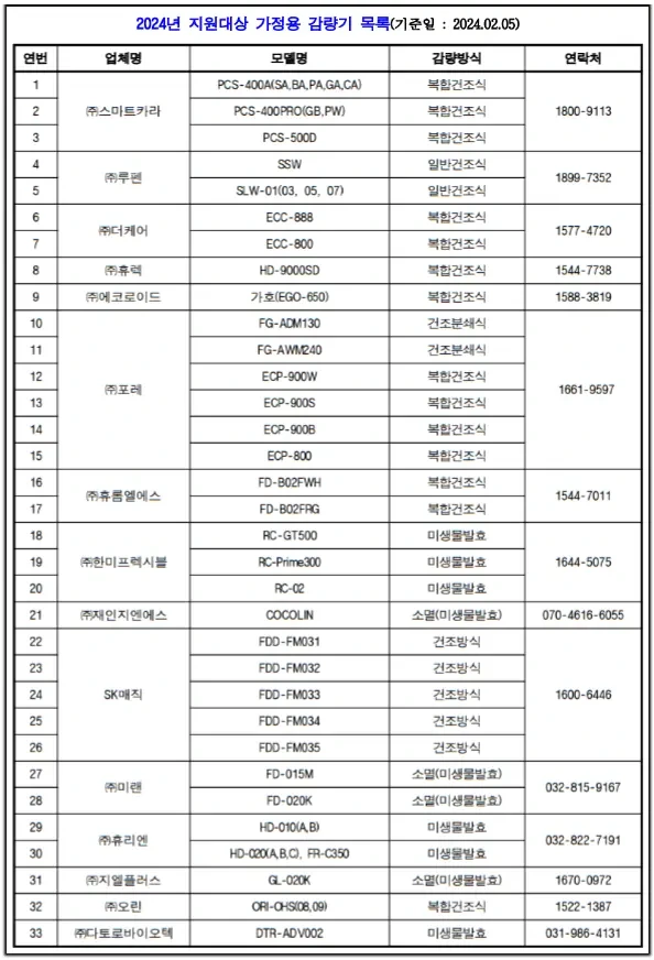 지원받을 수 있는 음식물처리기는 다양합니다. 2024년 기준으로 지원 대상이 되는 음식물처리기 목록은 다음과 같습니다. 이 목록에는 각 제조사, 모델명, 처리 방법 등이 포함되어 있으며, 총 33개의 모델이 등록되어 있습니다.