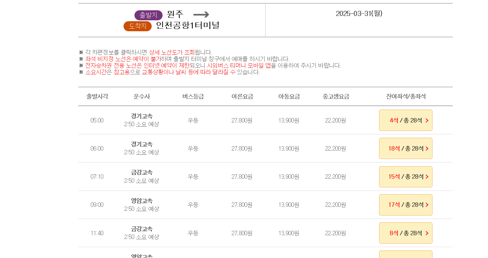 원주 인천공항 리무진 시간표