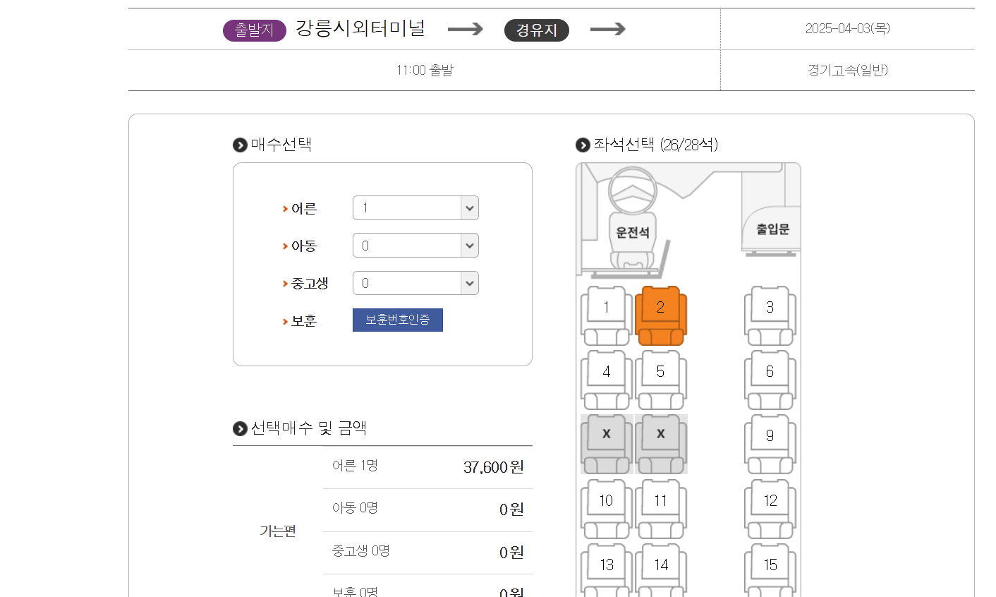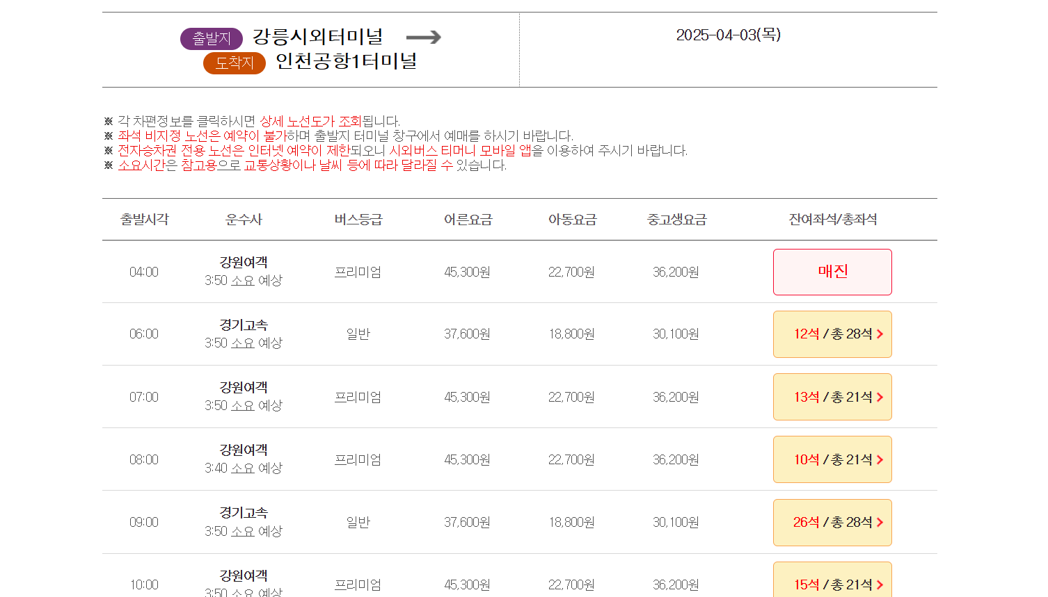 노선 및 시간 선택: 출발지(강릉), 도착지(인천공항), 날짜와 시간을 선택합니다.