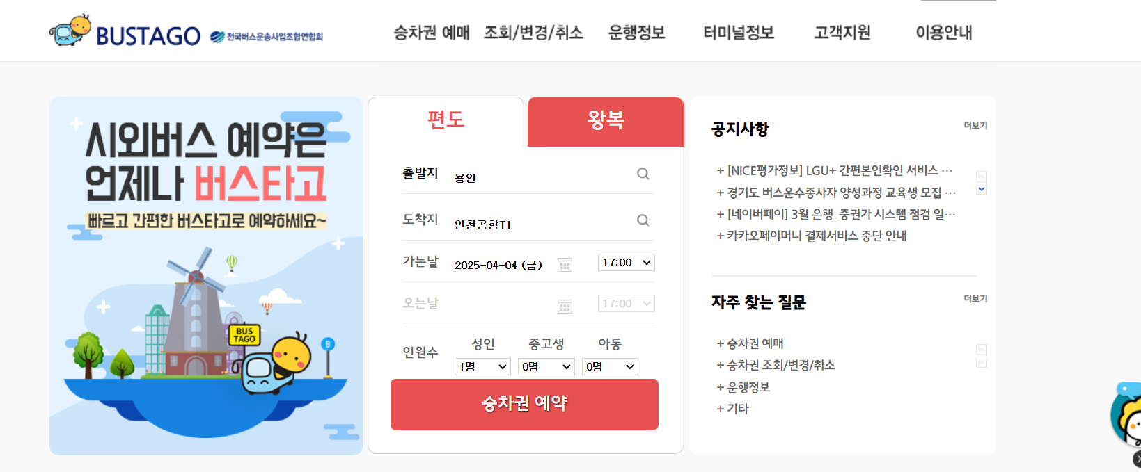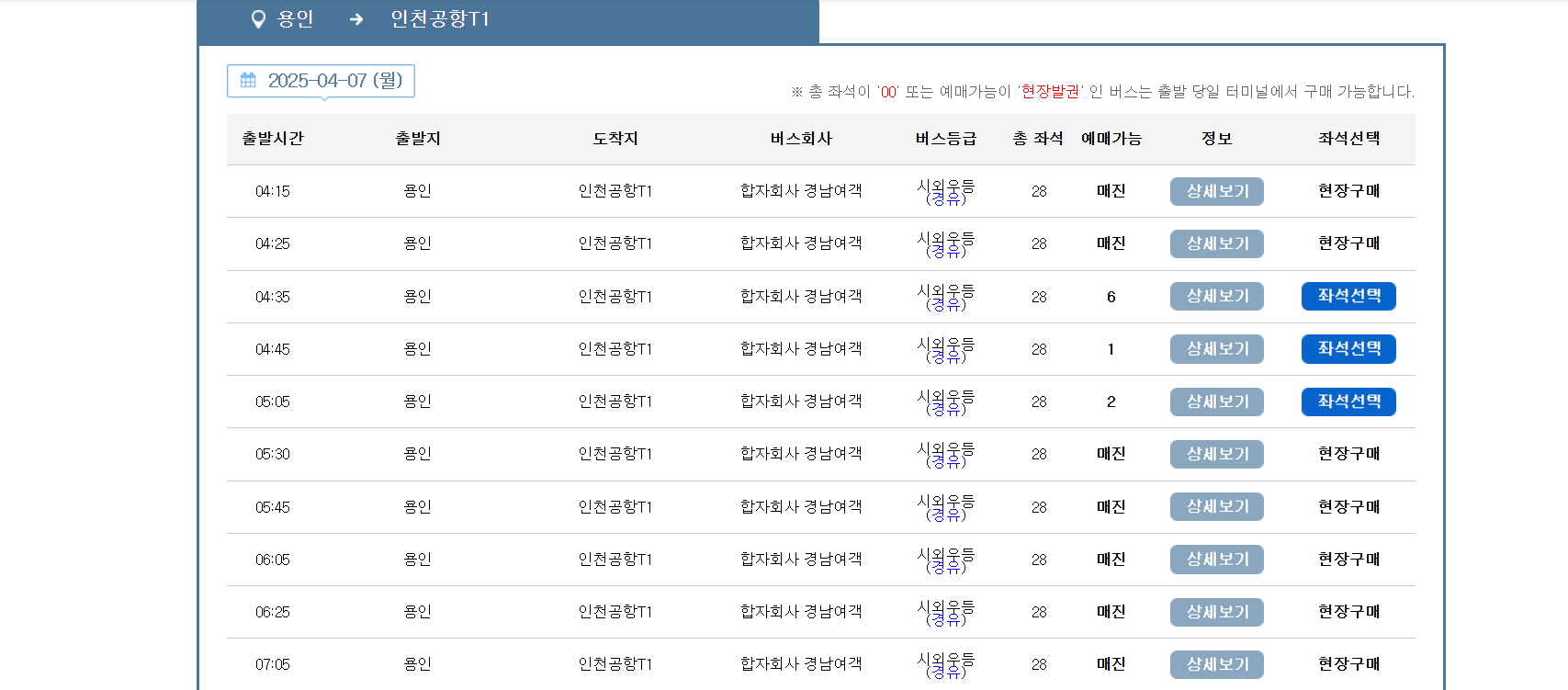 "방향을 반대로 선택하면 예매 시스템에서 노선이 검색되지 않습니다. 출발지/도착지 설정 시 용인↔인천공항 방향을 정확히 선택해야 합니다."