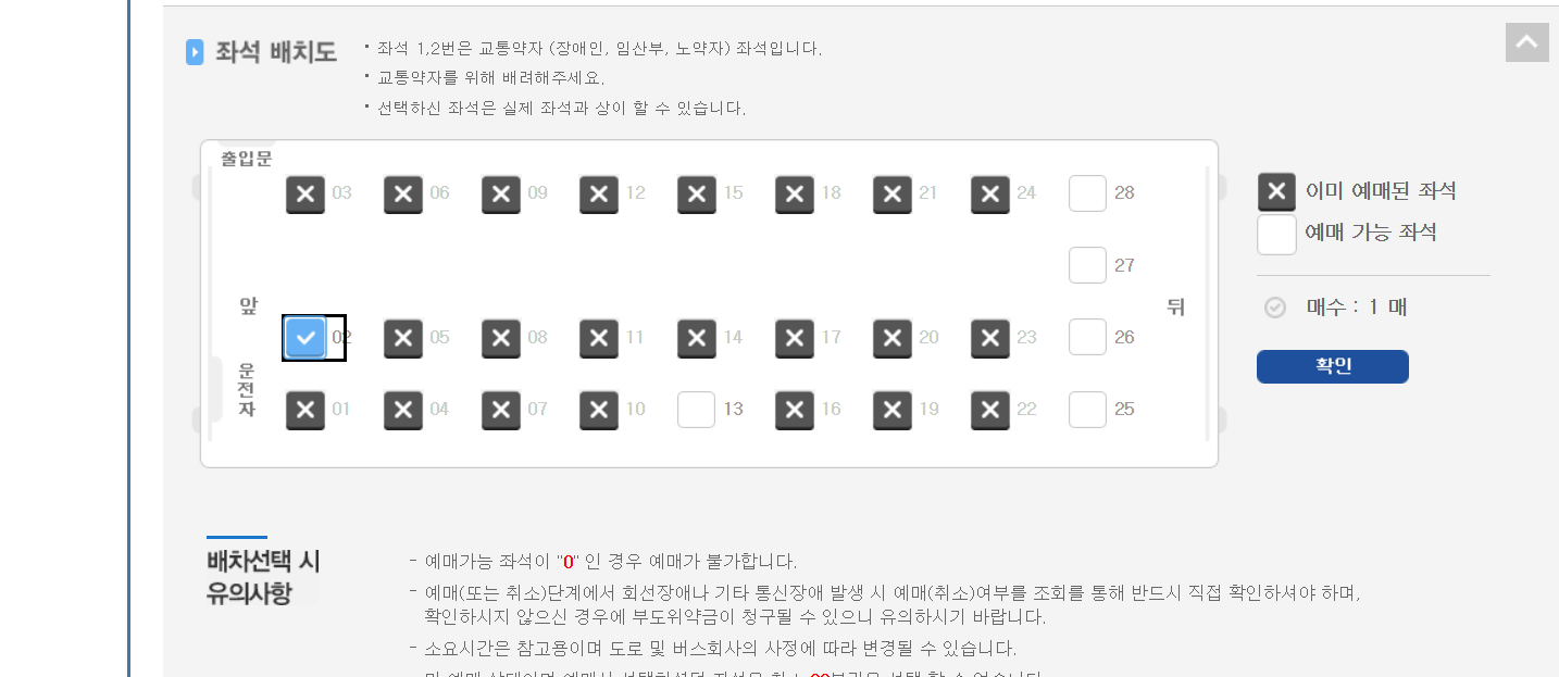 좌석 선택: 양방향 모두 지정좌석제 운영 (미예약 시 탑승 불가)