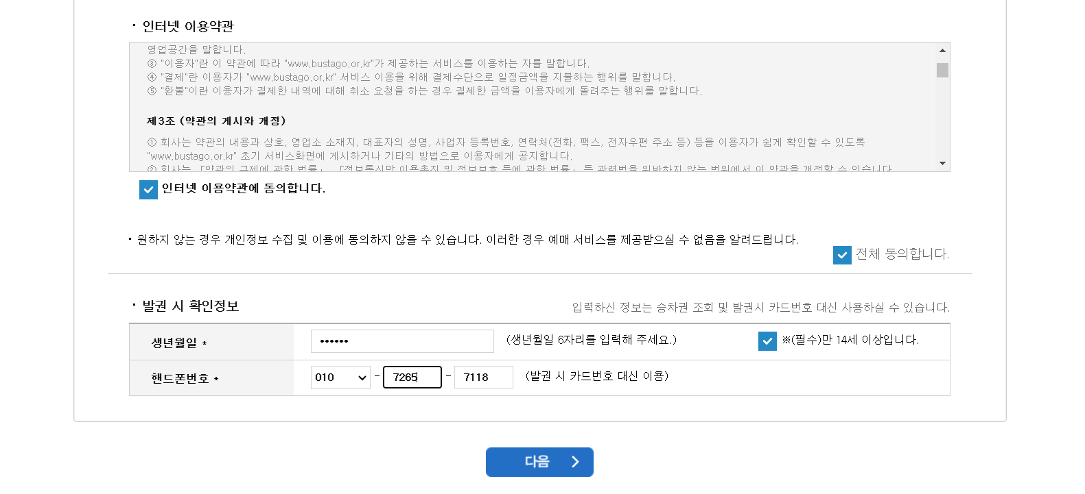 승객 유형(일반/중고생/아동)을 선택합니다. 약관에 동의합니다