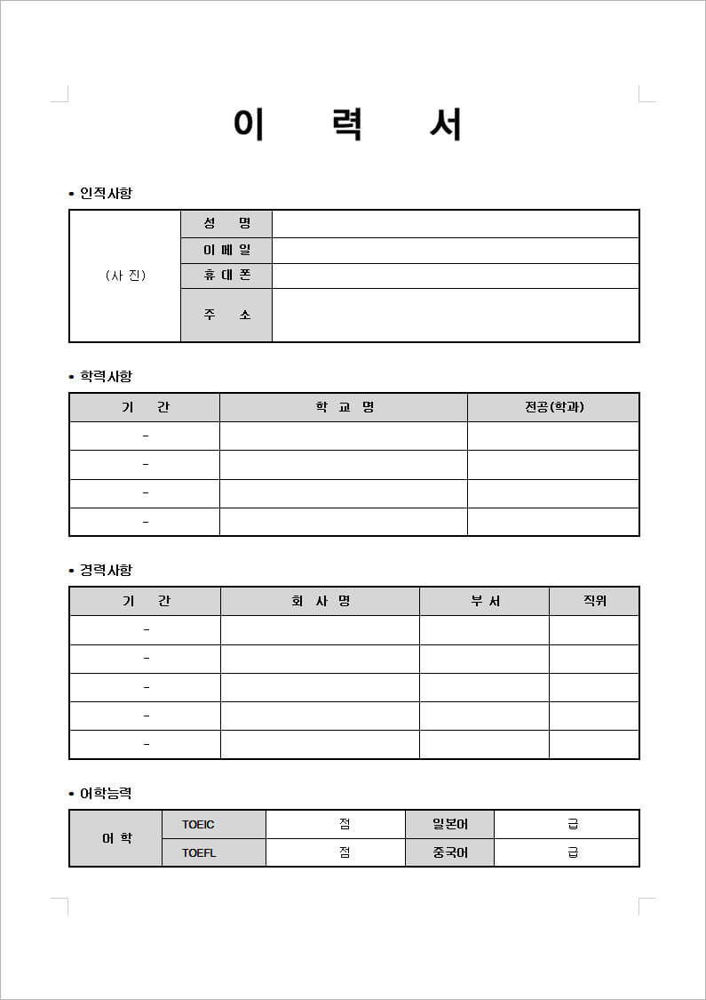 이와 같은 형식으로 이력서를 작성하면 됩니다.
