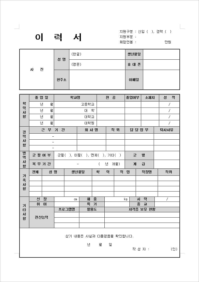- 학력: 가장 최근 학력부터 나열하며, 대학 이상의 학력을 작성하는 것이 일반적입니다. 학교명, 전공, 졸업 여부 등을 포함합니다.