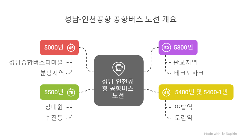 성남에서 인천국제공항으로 가는 공항버스는 여러 노선이 운영되고 있어 선택의 폭이 넓습니다. 주요 노선으로는 5000번, 5300번, 5400번, 5400-1번, 5500번 등이 있으며, 각 노선은 성남의 주요 정류장을 경유해 제1여객터미널(T1)과 제2여객터미널(T2)로 향합니다.