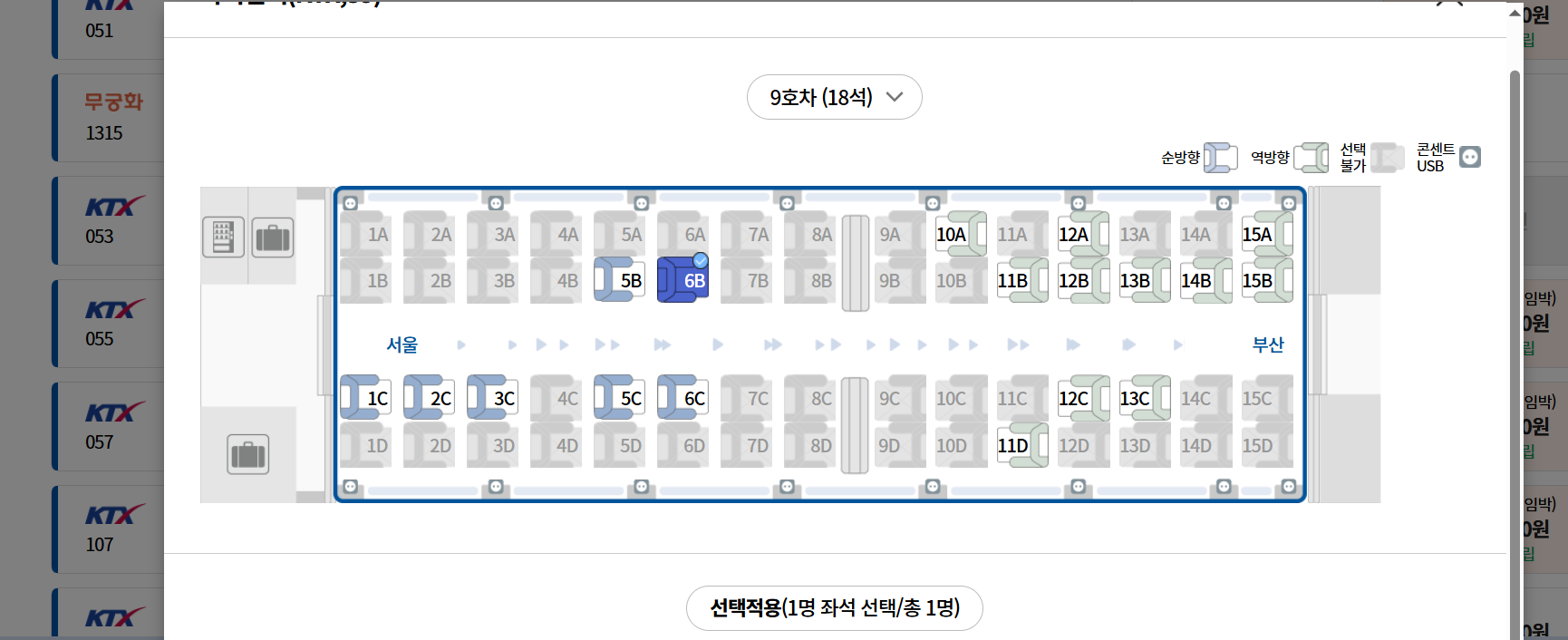 다양한 좌석 옵션: 특실, 일반실, 입석, 자유석 등 선택 가능.