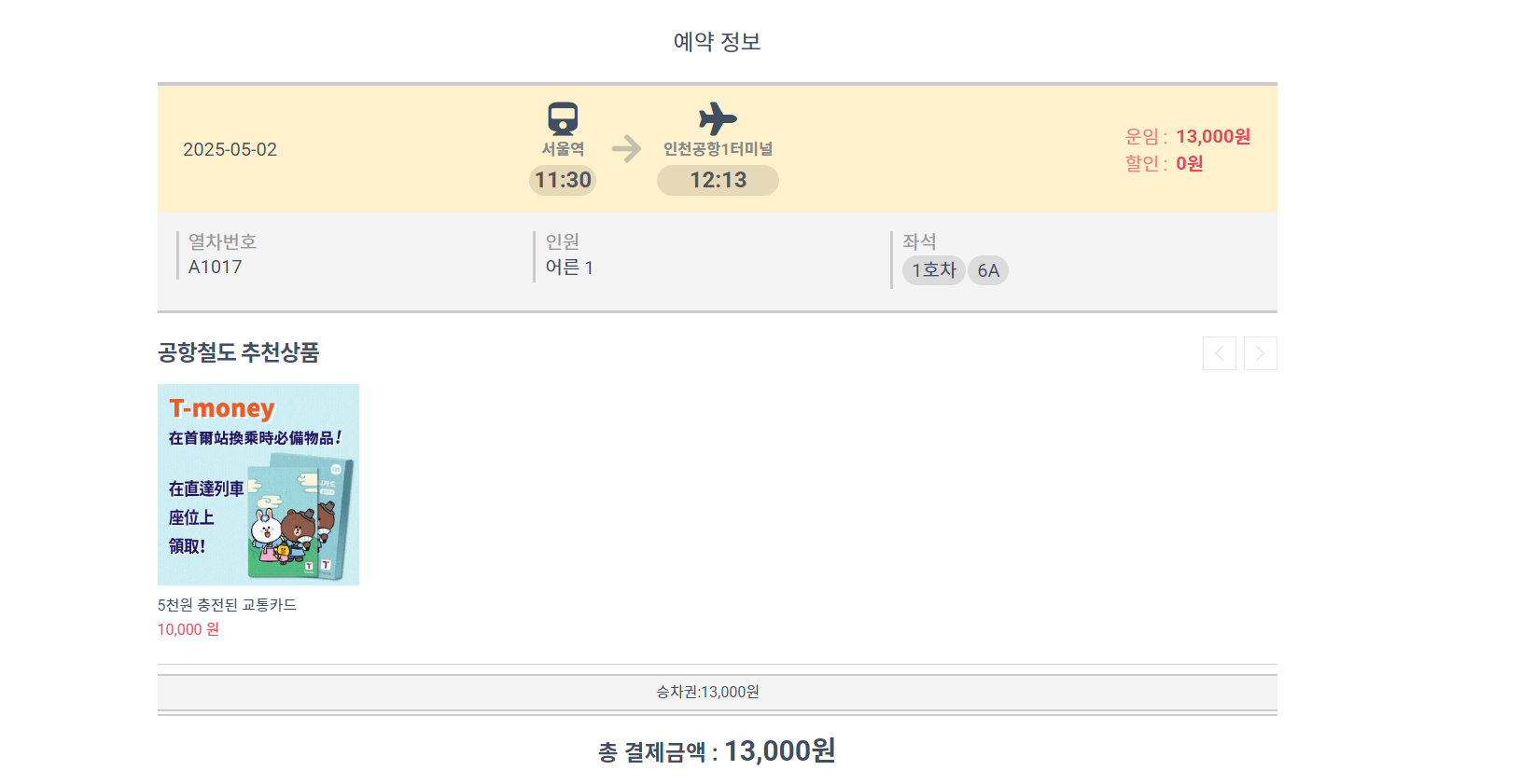서울역인천공항 1 터미널: 4,1505,000원(교통카드 기준)