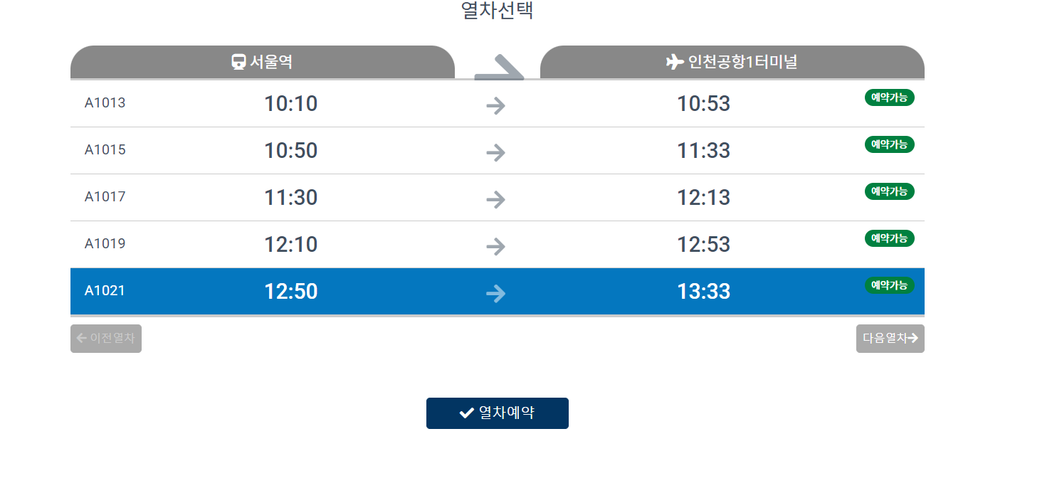 출발역(서울역, 인천공항 1 터미널, 인천공항 2 터미널)과 시간을 선택해 예약.