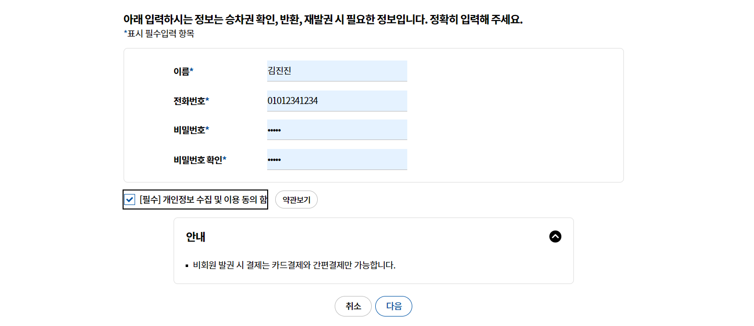 예매자의 정보를 입력하고,