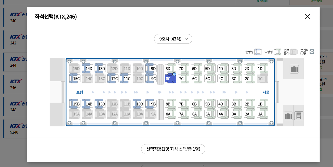 좌석 등급(일등석/이등석) 및 순방향/역방향 선택