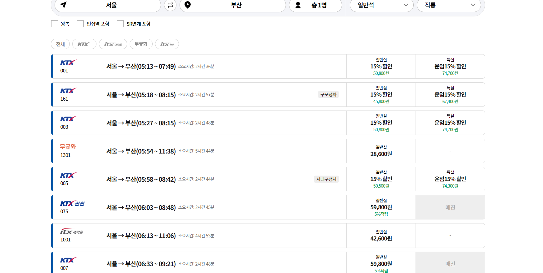 검색 결과에서 원하는 KTX 열차를 선택. (KTX, ITX-새마을, 무궁화호 등이 표시됨)