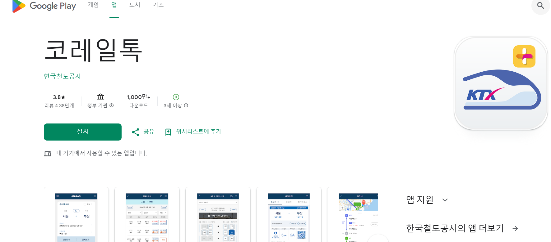 사진 삽입 제안: 구글 플레이스토어에서 "코레일톡" 검색 화면 캡처. 앱 아이콘과 "설치" 버튼이 보이도록.