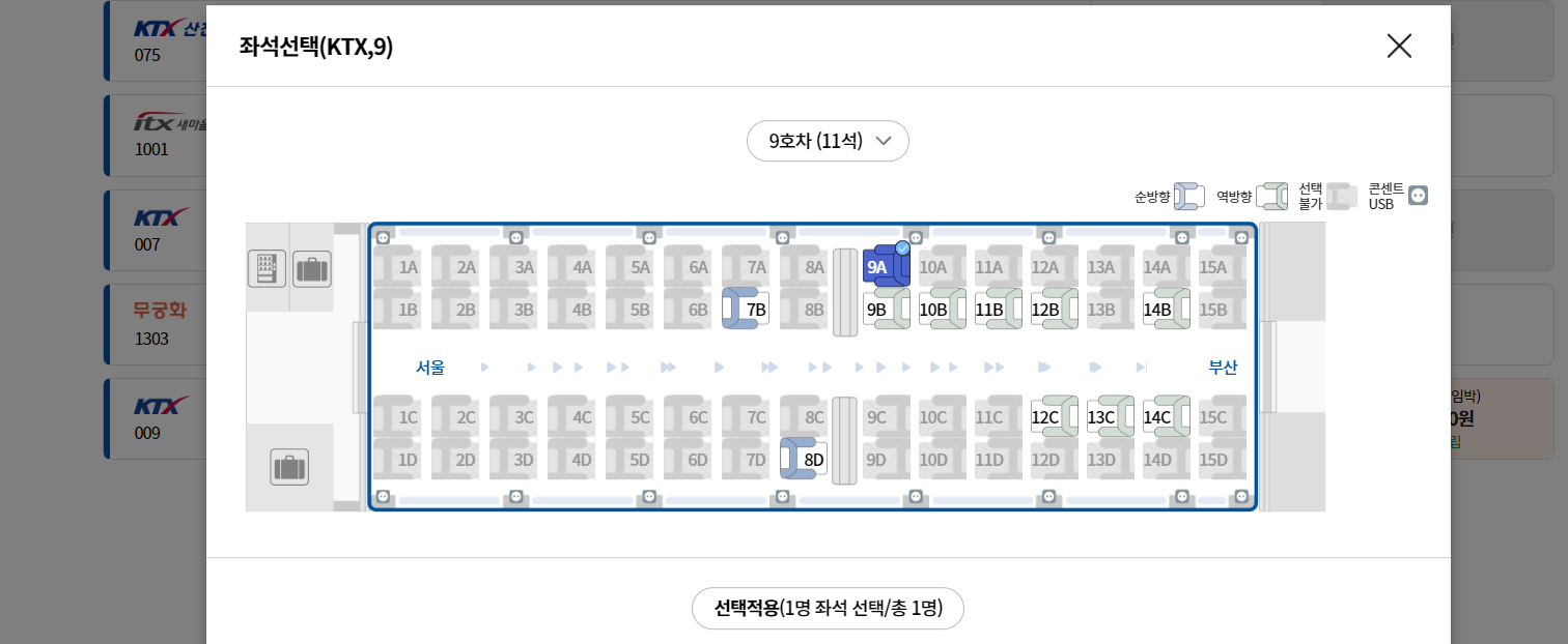 원하는 호차와 좌석을 선택. (예: 5호차 1A는 콘센트가 있는 명당!)