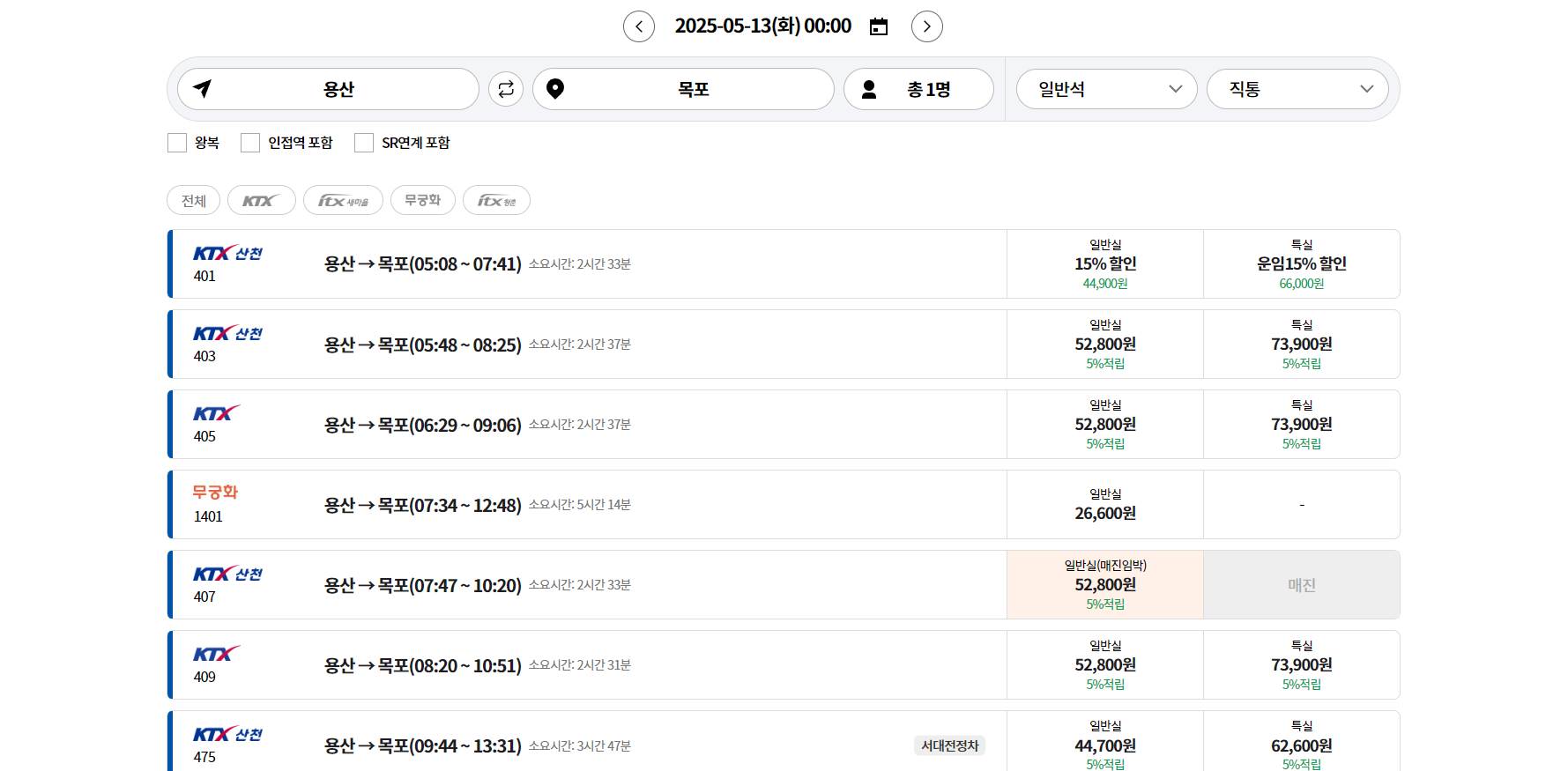 용산 → 목포: 약 2시간 30분