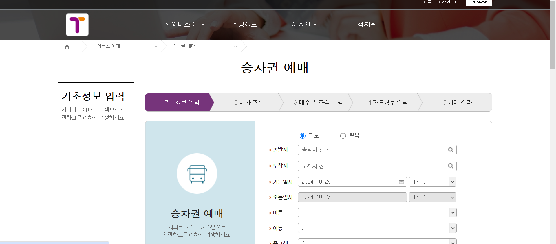 3. 예매화면에 출발지와 도착지 시간을 입력하여 예매를 진행할 수 있습니다