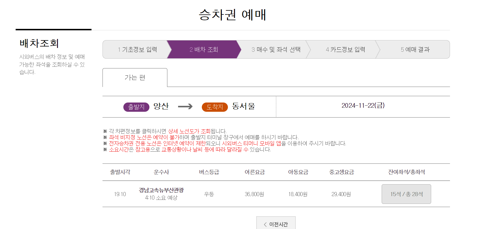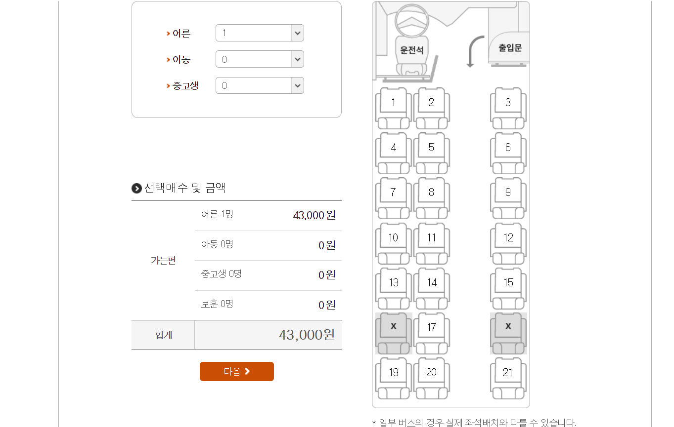 원하는 출발 시간의 '잔여좌석' 선택