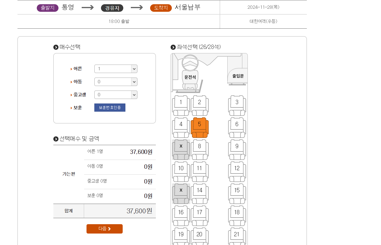 요금: 우등 38,600원, 프리미엄 45,200원