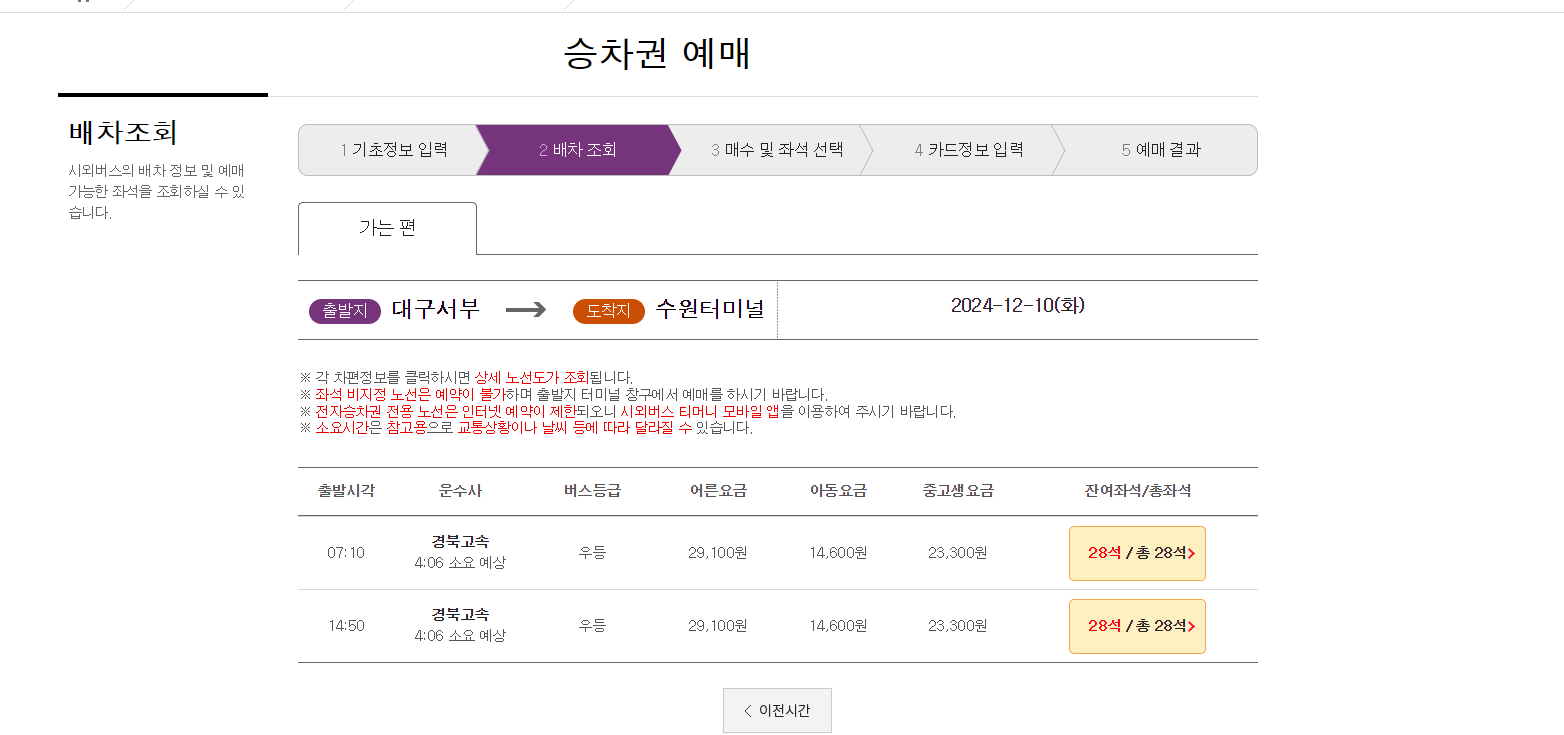 출발지를 '대구서부'로 선택합니다.