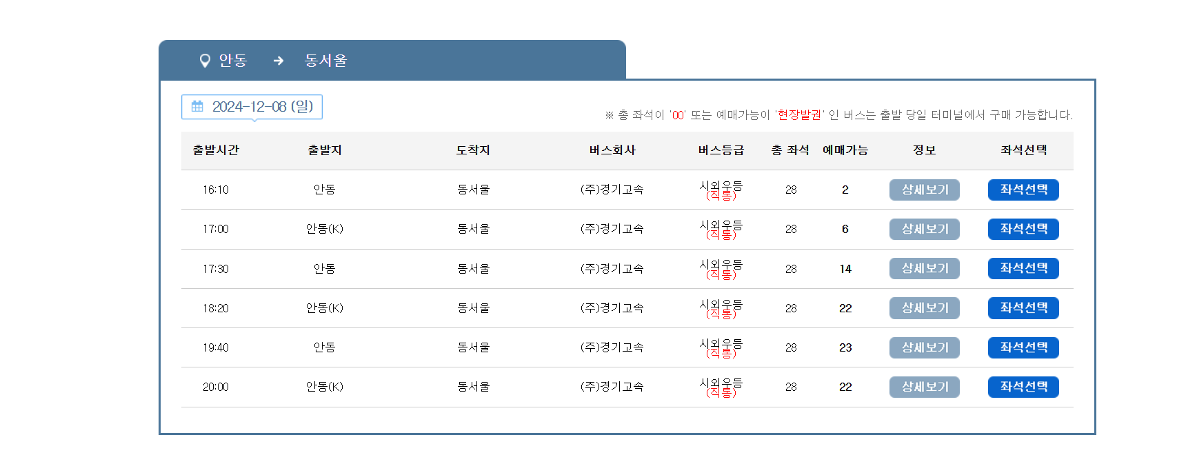 출발지를 '안동'으로, 도착지를 원하는 목적지로 선택합니다.