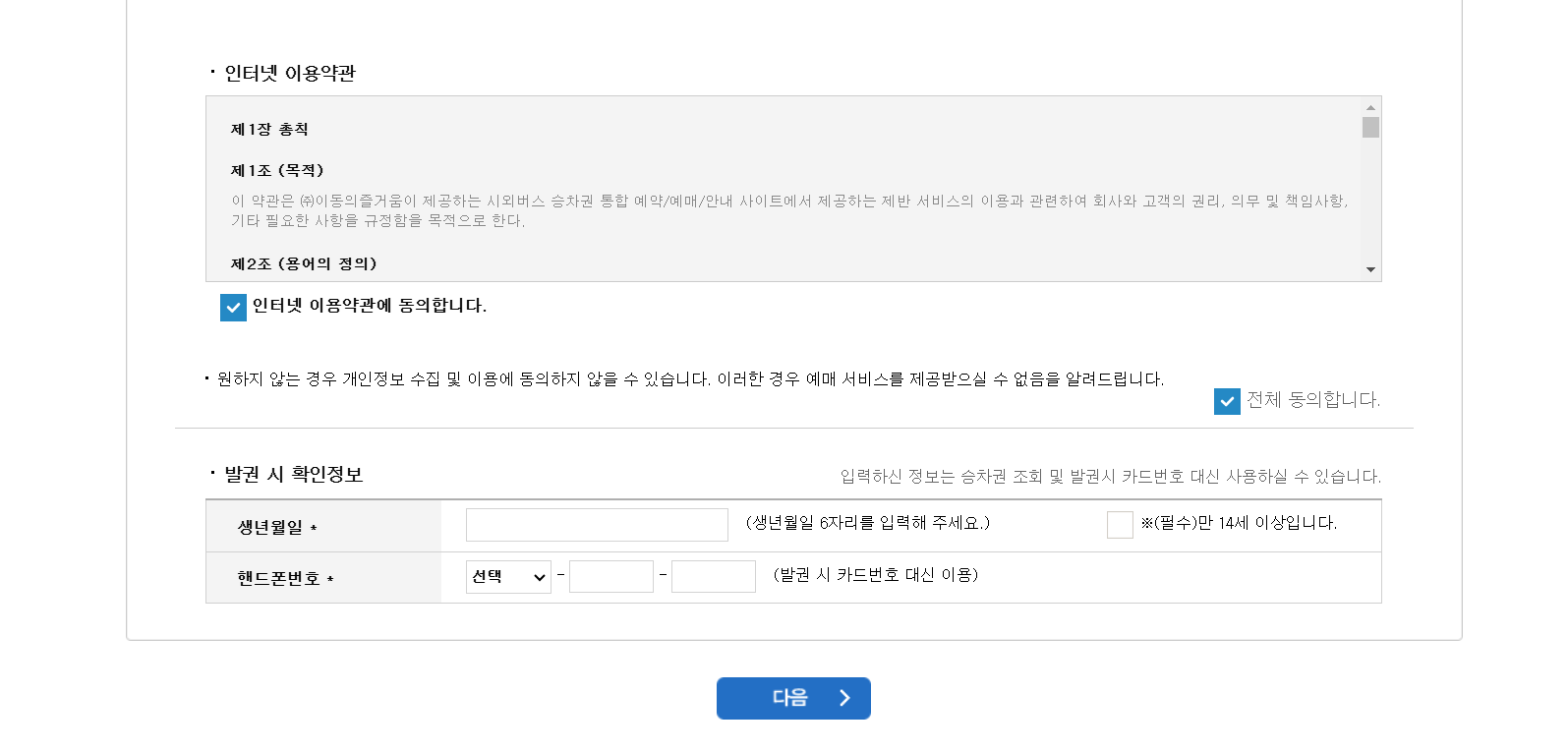 탑승자 정보(생년월일, 연락처)를 입력합니다.
