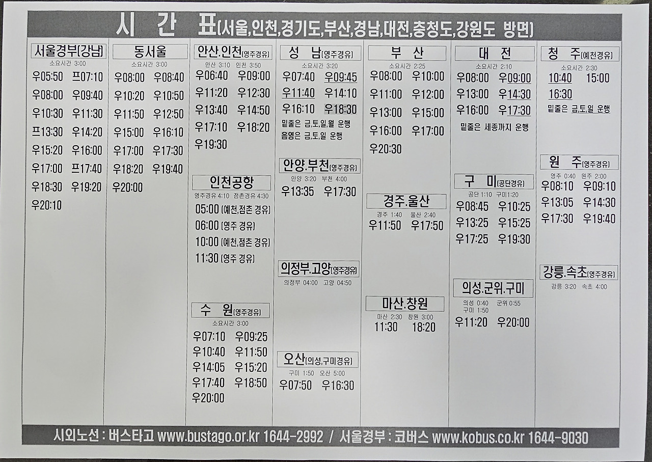 안동 터미널에서는 고속버스도 운행되고 있습니다. 주요 노선 중 하나인 안산 방면의 시간표를 예로 들어보겠습니다.