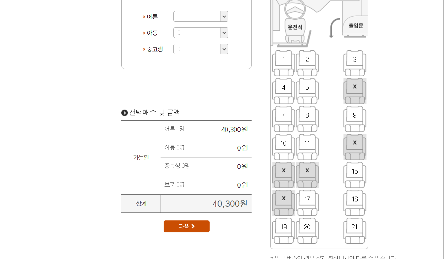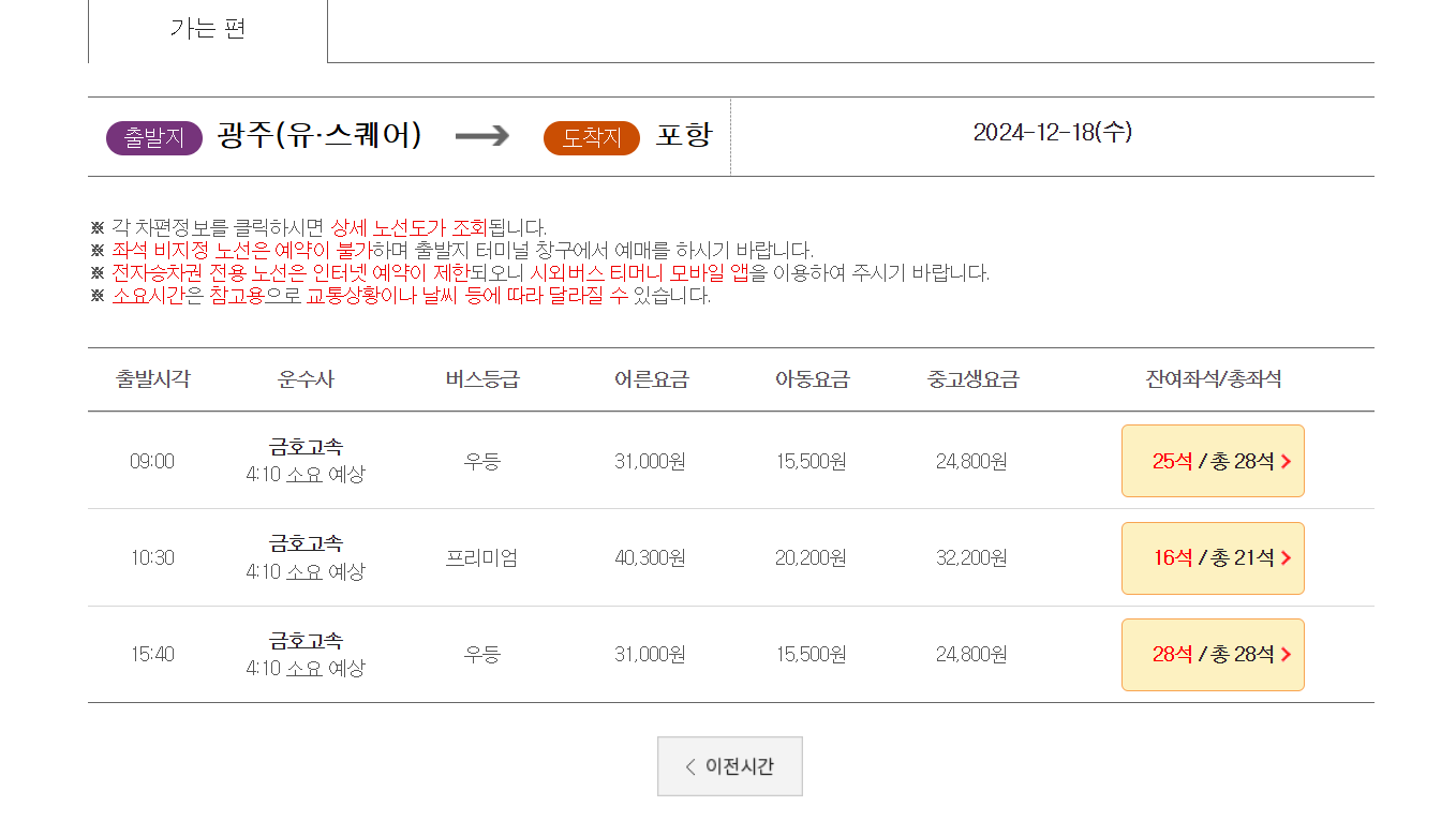 - 예매 마감 시간 : 당일 출발 차량의 경우, 출발 시간 1시간 전까지 예매가 가능합니다. 출발 시간이 임박한 경우, 모바일 앱을 통해 예매하는 것이 좋습니다.