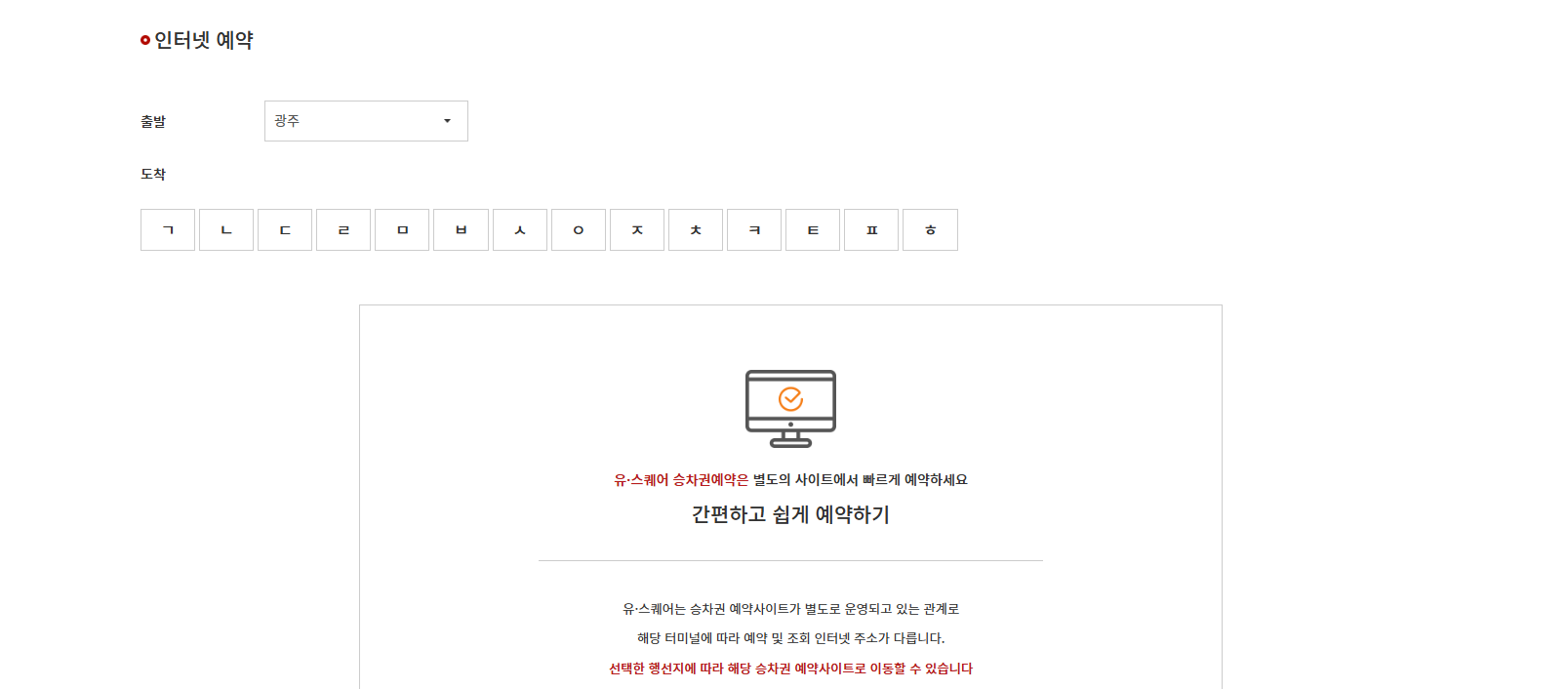 유스퀘어 홈페이지에 들어가 승차권예약 메뉴로 들어갑니다. 아래와 같이 되어있습니다