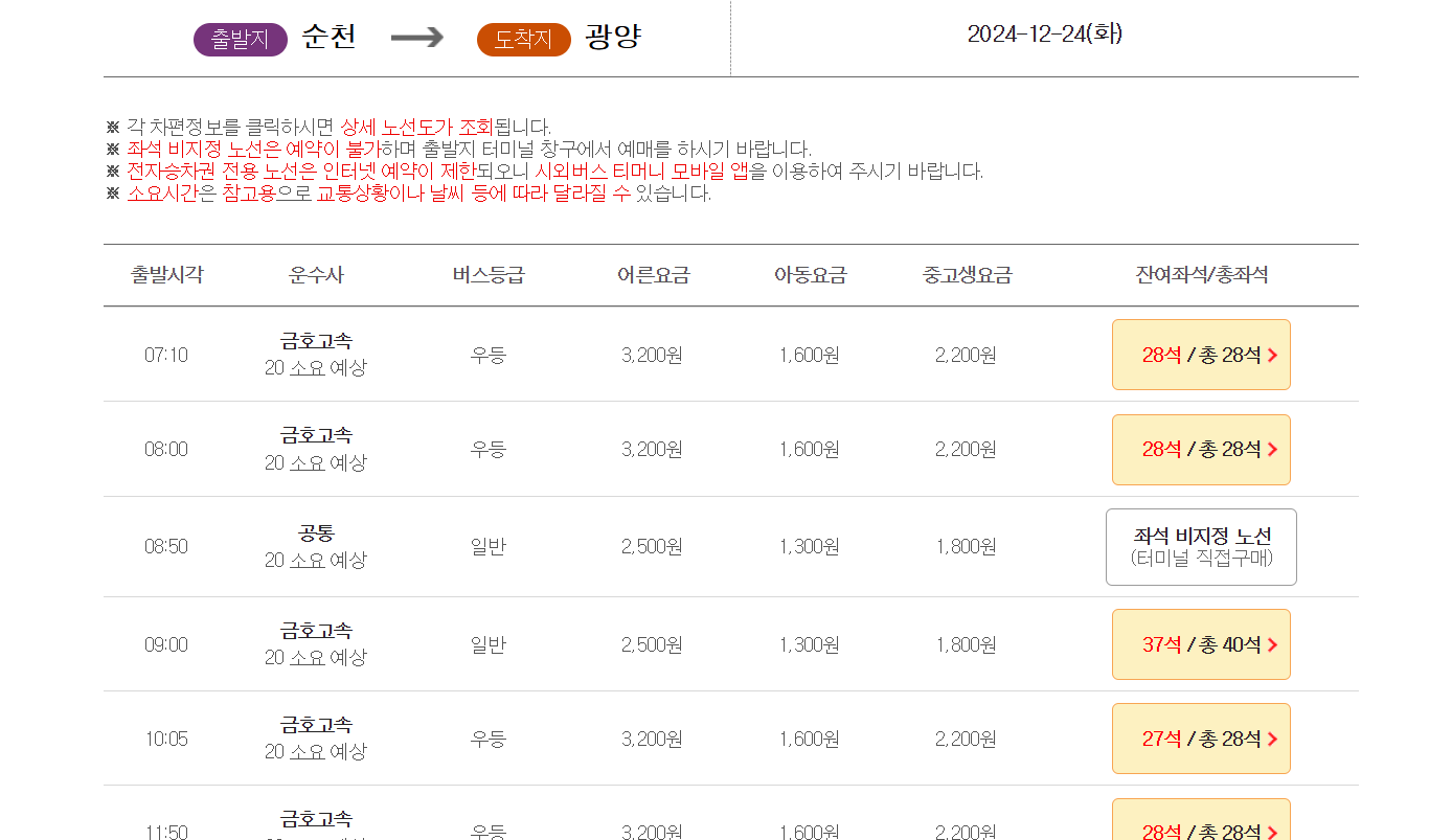 - 출발 시간: 오전부터 오후까지 다양한 시간대 운행