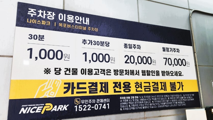 주차장 요금; 30분에 천원, 이후 30분당 천 원이 추가되며,