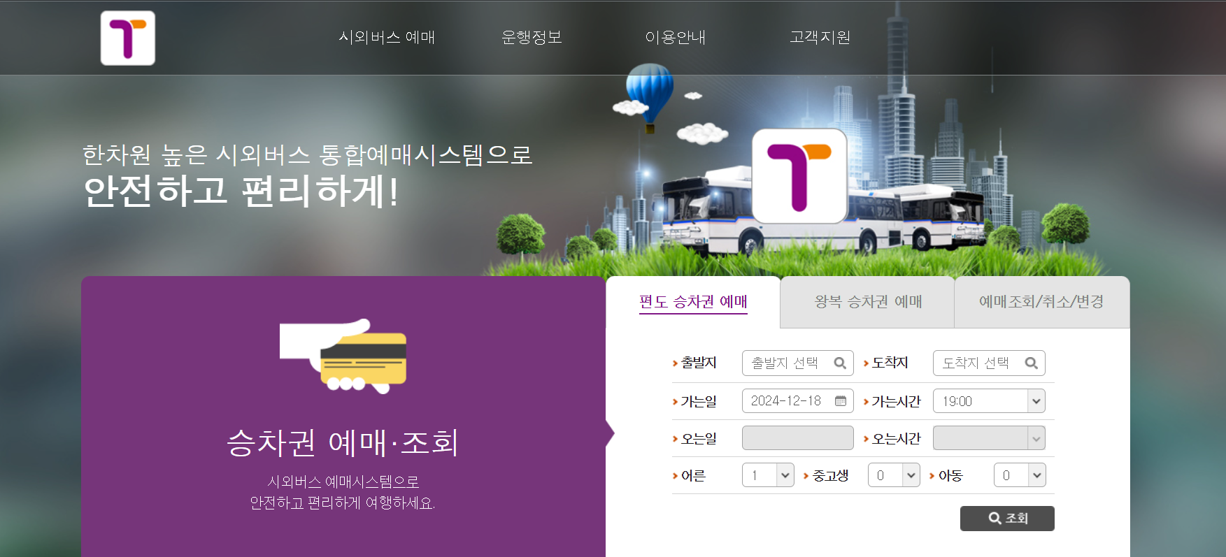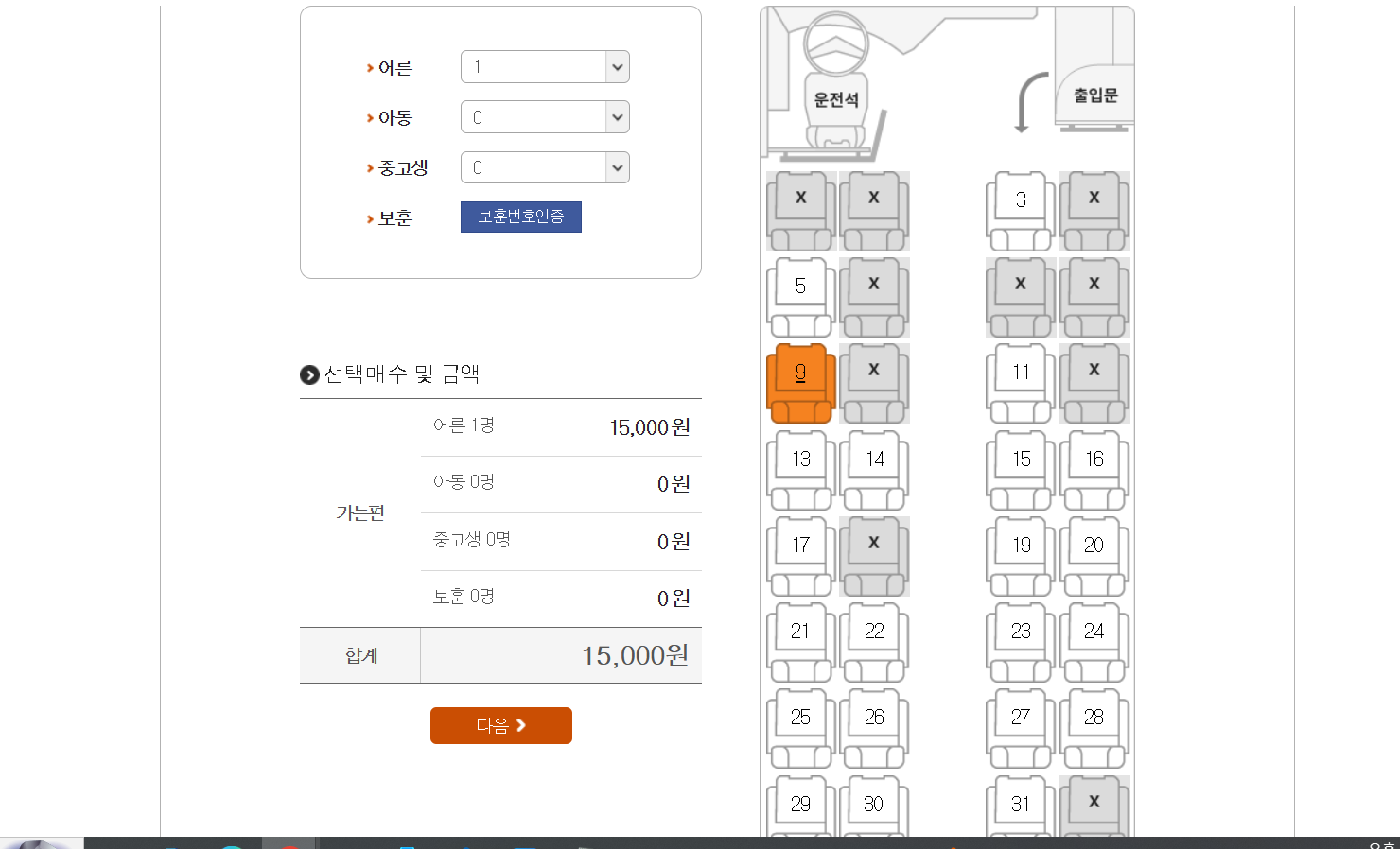 원하는 날짜와 시간, 목적지를 선택하고 좌석을 고르면 됩니다.