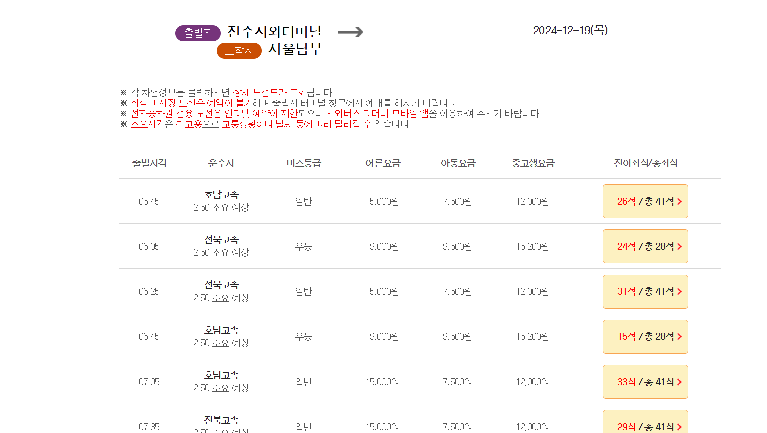 전주시외버스터미널에서 운행되는 세부 노선의 시간표를 몇 가지 살펴볼까요? 2024년 12월 18일 기준으로 운행되는 시간표를 확인해 보겠습니다.