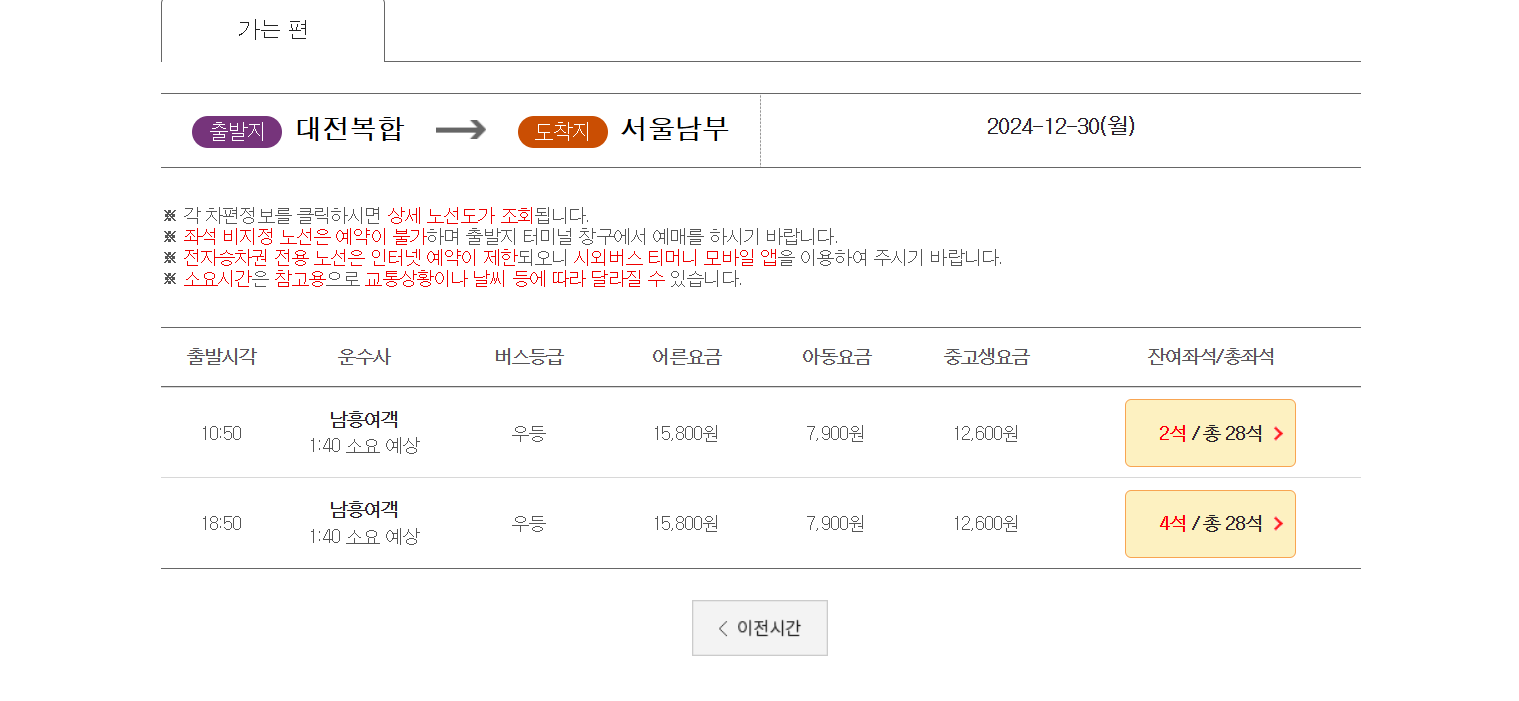 07:40 (우등) - 요금: 18,100원, 소요시간: 2시간