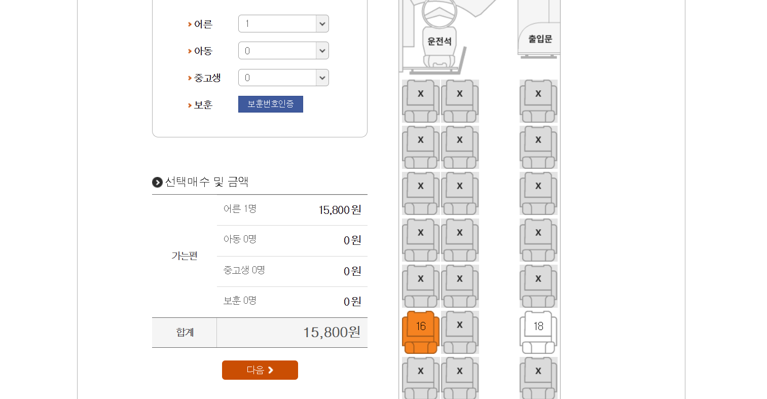 08:00 (우등) - 요금: 18,000원, 소요시간: 1시간 55분