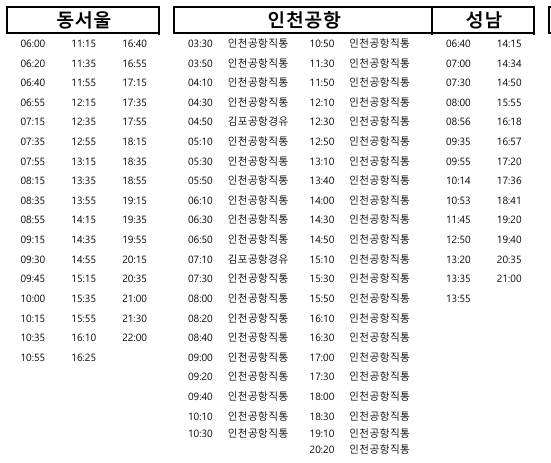 동서울종합터미널 방면으로 운행되는 버스의 시간표입니다