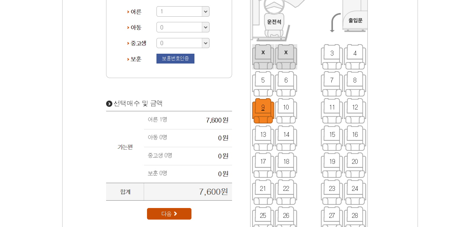 인원수를 입력하고 좌석을 선택합니다