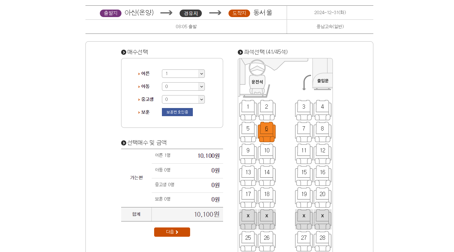 승객 유형(성인/중고생/아동)을 선택합니다.