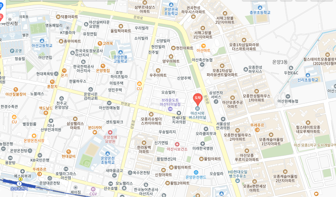 기차 환승: 기차를 이용하실 분들은 온양온천역을 이용하시면 됩니다. 터미널에서 버스로 약 15분 거리에 위치해 있어요