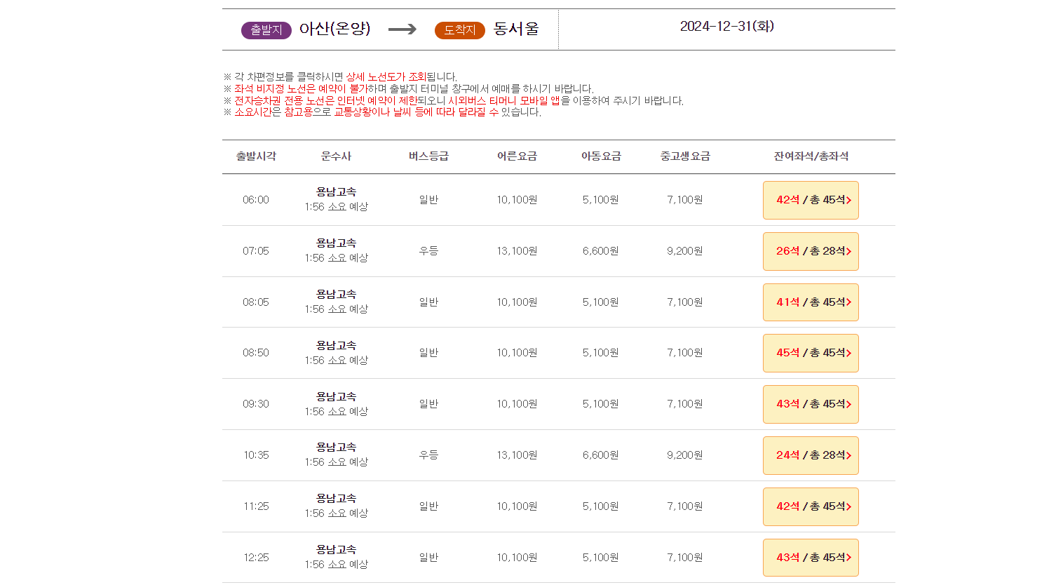 아산 시외버스터미널은 다양한 노선을 운영하고 있습니다. 주요 노선별 시간표를 살펴볼까요? (2024년 3월 21일 기준)