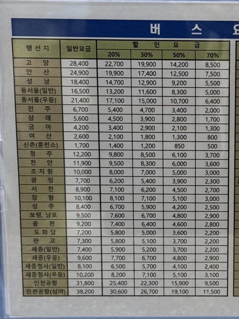 일반요금과 할인요금(20%, 30%, 50%, 70%)이 적용되며, 자세한 요금은 터미널에서 확인하실 수 있습니다