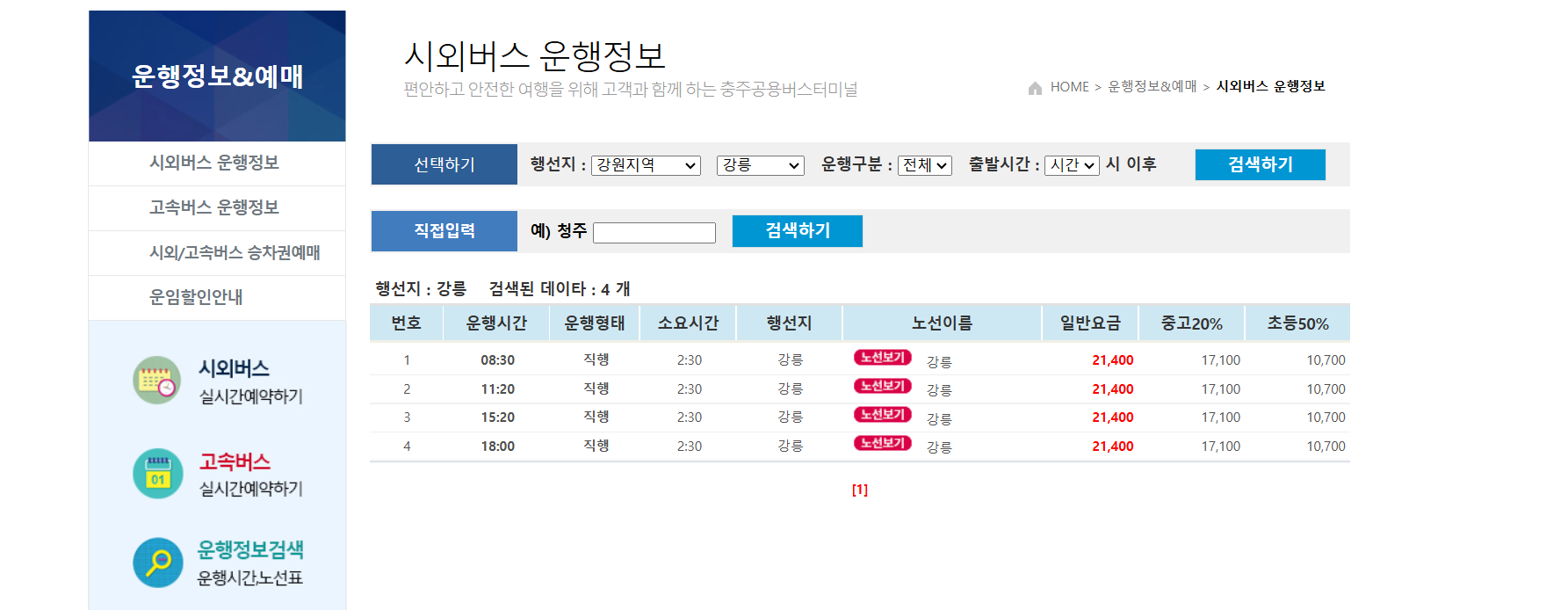시외버스 노선: '시외버스통합예매시스템' 웹사이트 또는 앱