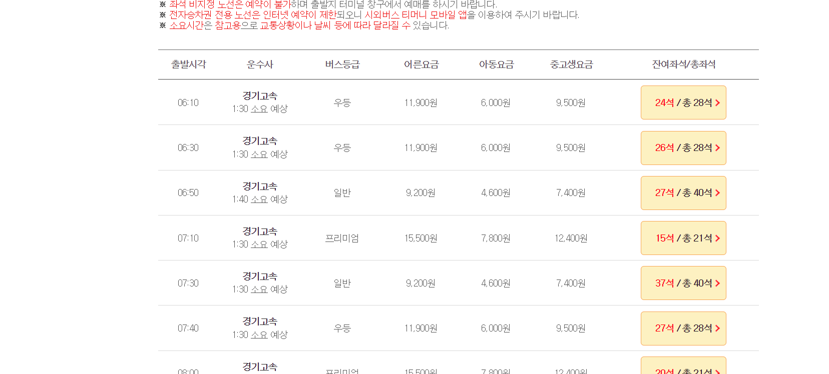 모두 우등 버스로 운행되며, 요금은 26,300원입니다. 소요 시간은 약 3시간 30분입니다.