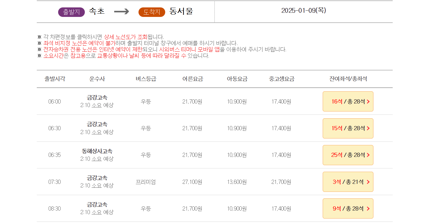 속초발 주요 노선 시간표