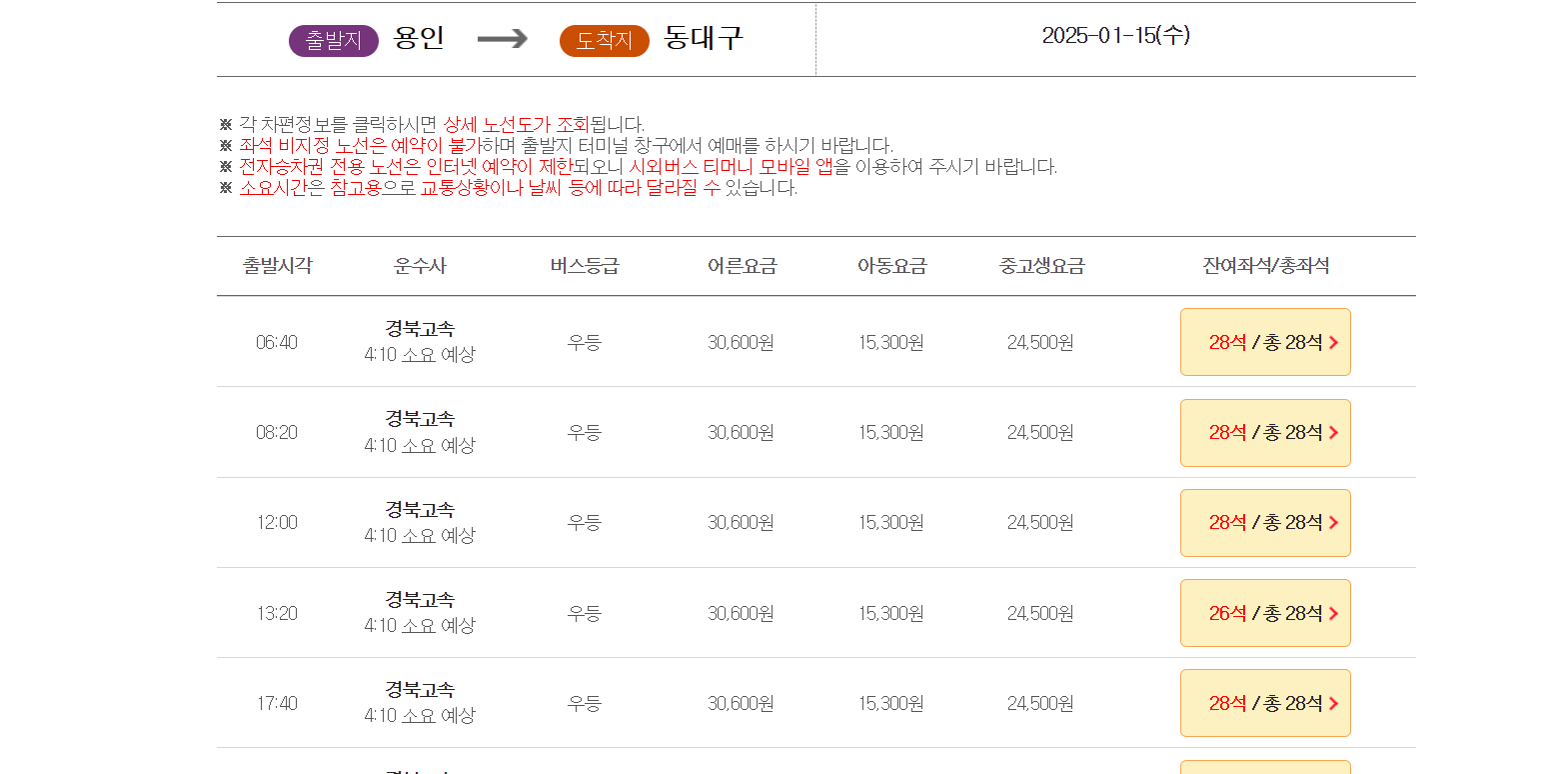 우등버스: 31,400원, 소요시간 약 3시간 30분