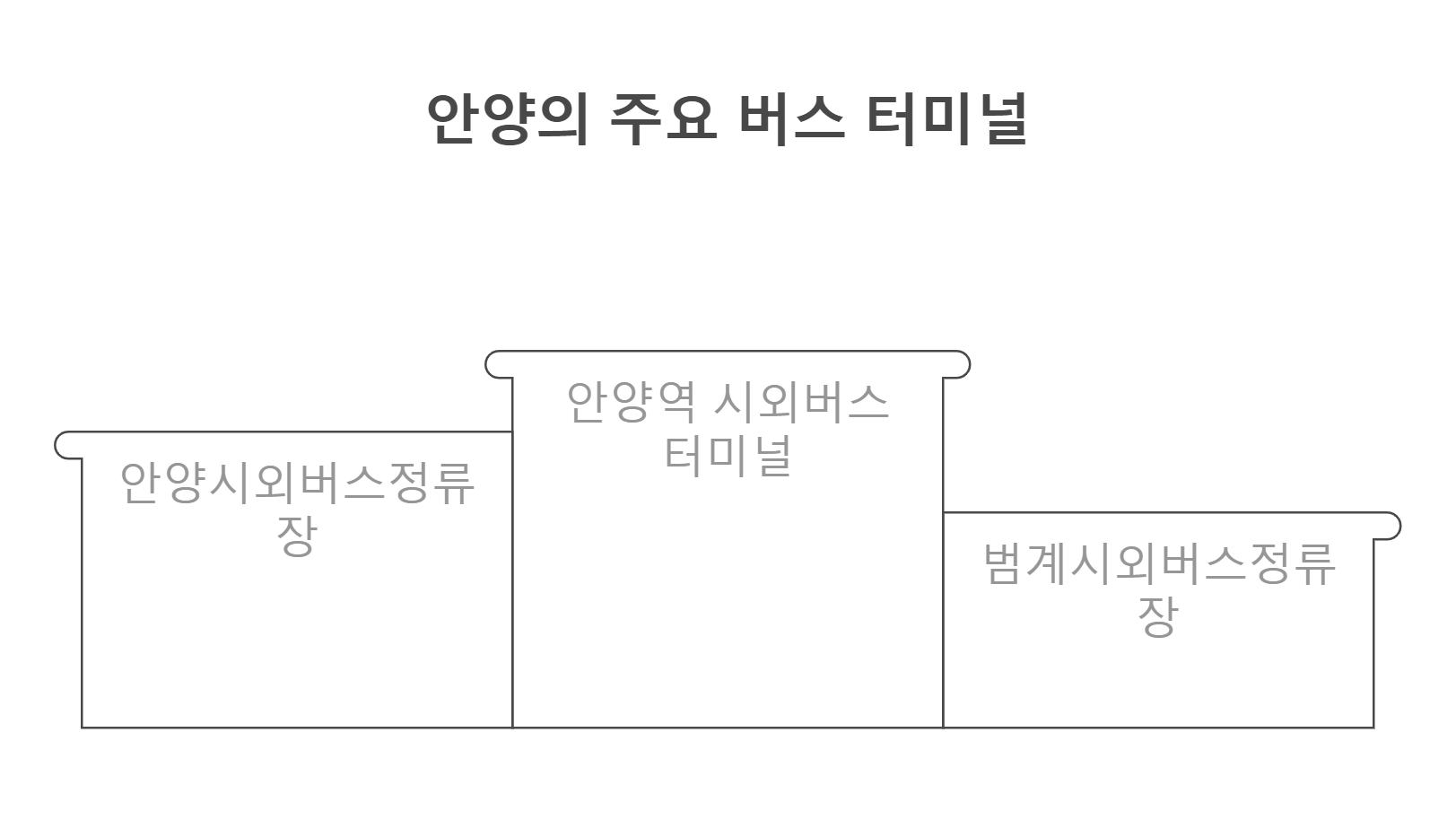 안양시에는 여러 시외버스 정류장이 있지만, 대규모 통합 터미널은 없습니다. 주요 시외버스 정류장은 다음과 같습니다: