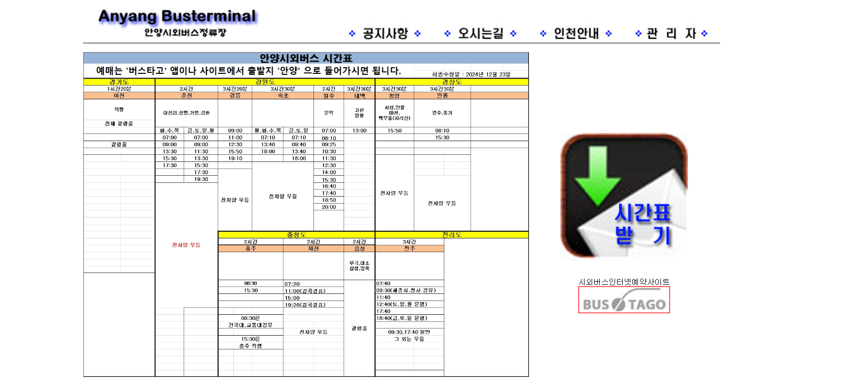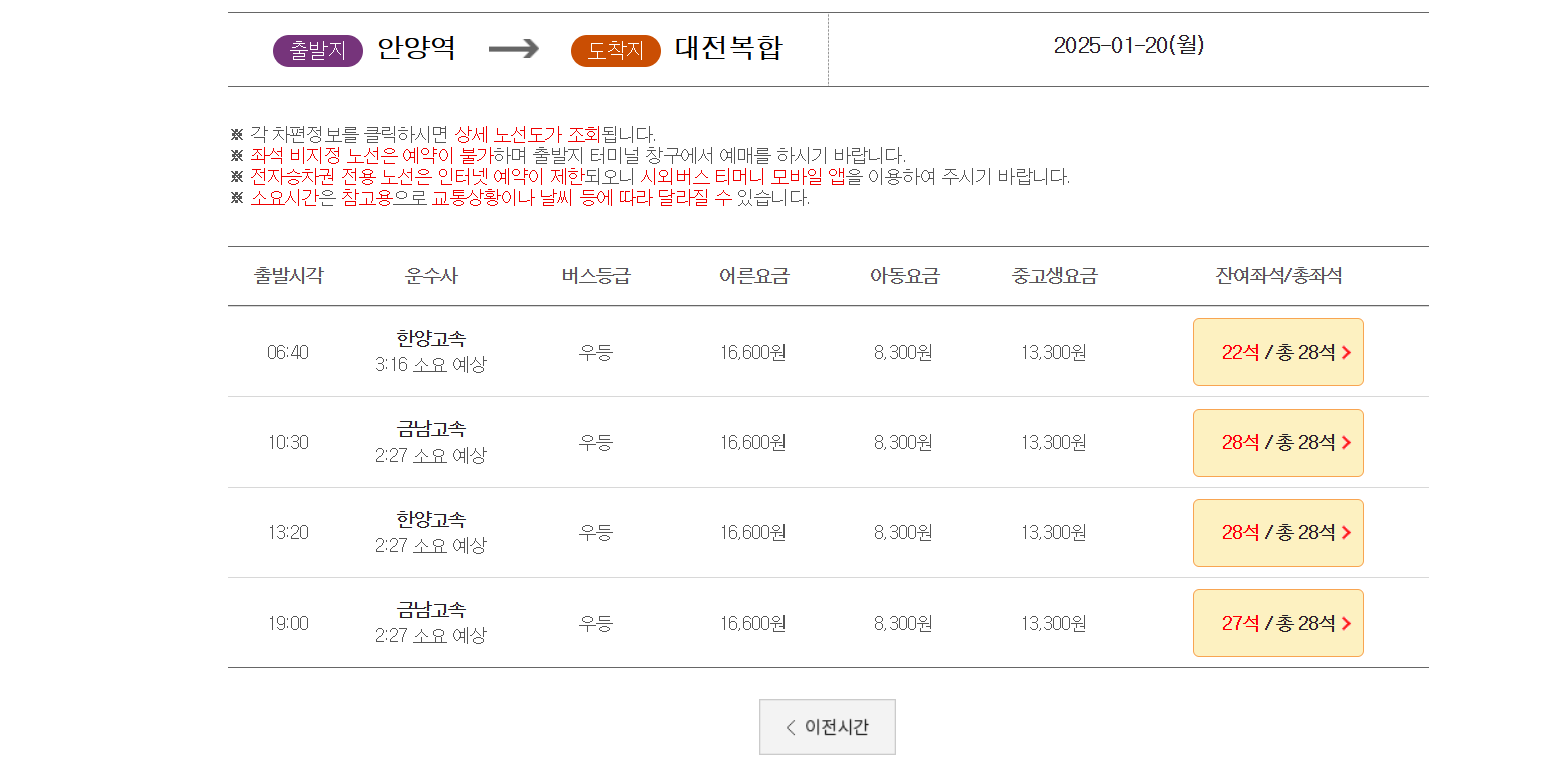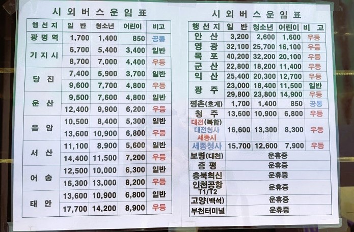 시외버스 시간표는 운수사 사정에 따라 변경될 수 있으므로, 출발 전 반드시 재확인이 필요합니다. 2023년 8월 28일부터 일부 노선의 출발 시간이 변경되었으니 주의가 필요합니다