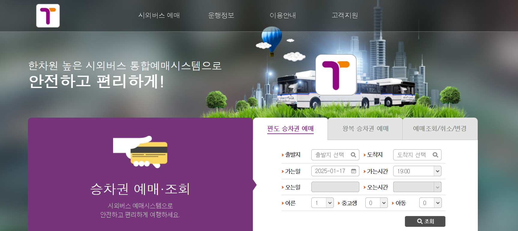 먼저 티머니 예매사이트에 접속합니다. 출발지와 도착지를 입력합니다