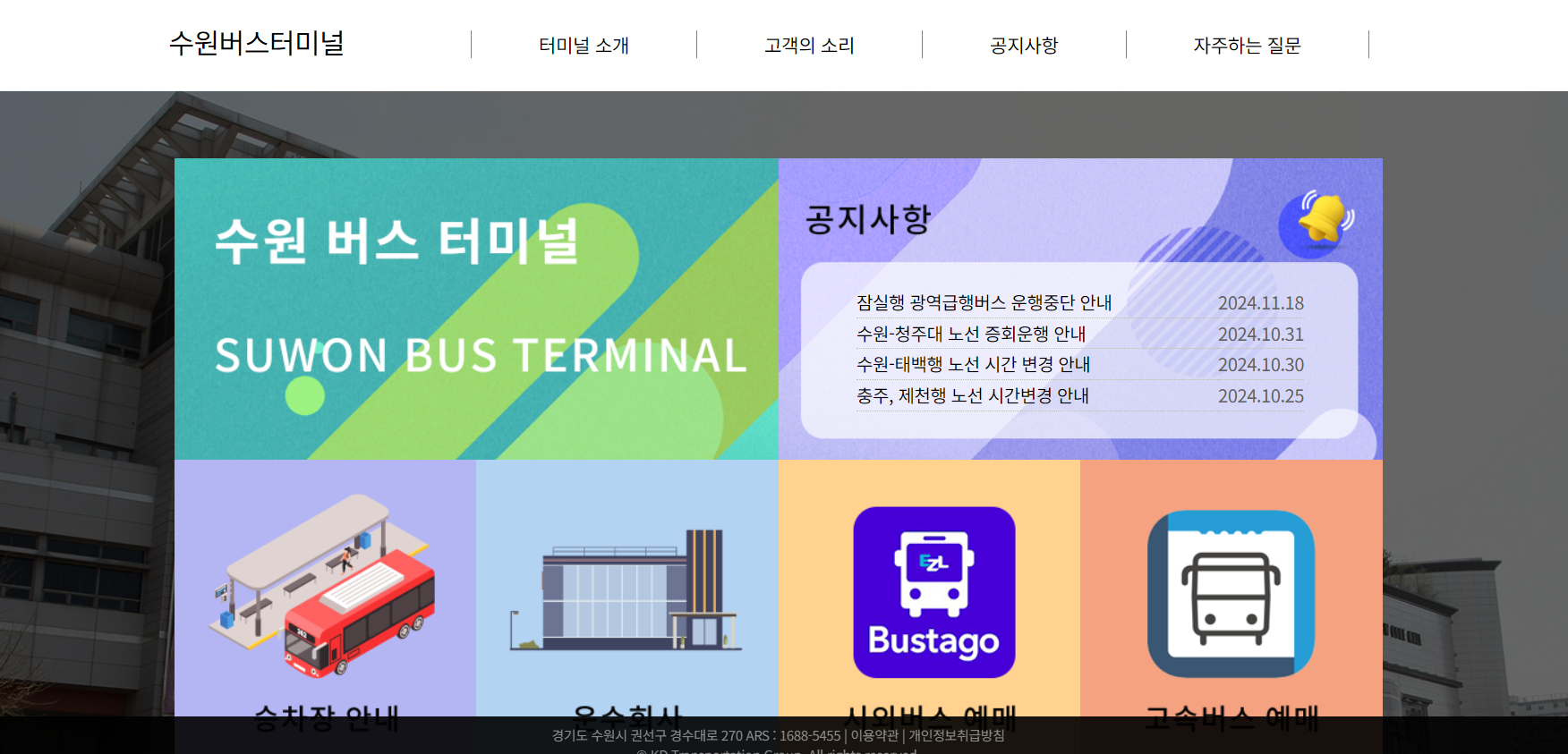 수원고속버스터미널은 경기도 수원시 권선구에 위치해 있으며, 서울과 지방을 연결하는 중요한 교통 거점입니다. 고속버스와 시외버스가 모두 운행되어 전국 각지로의 이동이 편리합니다.